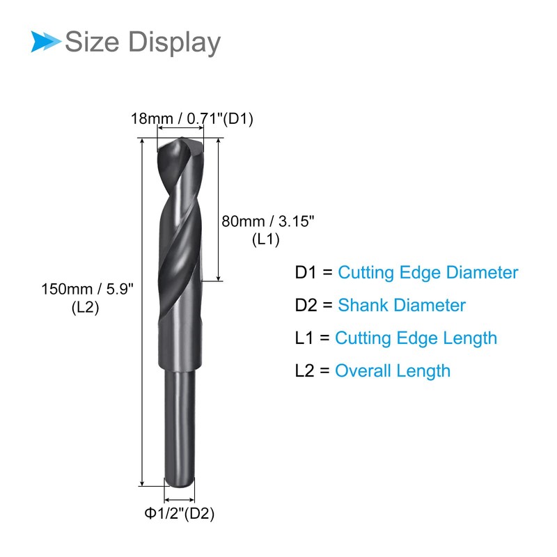 - ★ Drill size --- Cutting edge diameter: 18 mm/0.71 inches; Shank diameter: 1/2 inch; Cutting length: 80 mm/3.15 inch; Total length: 150 mm/5.9 inch; Hardness: HRC65-66; Cutting direction: right.