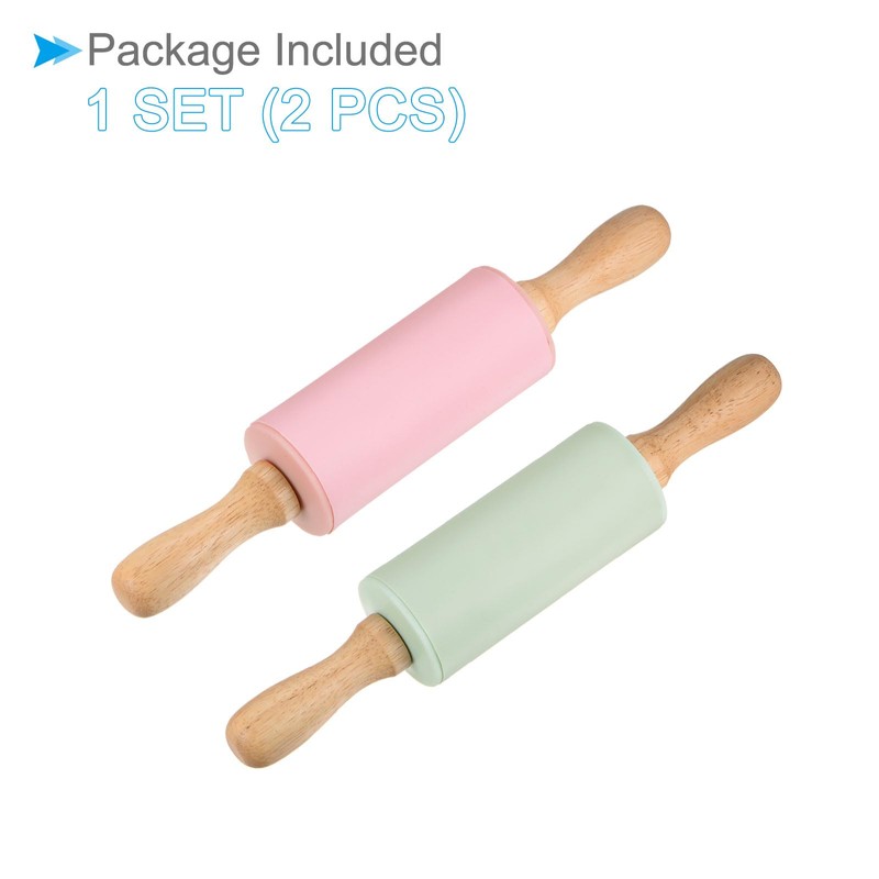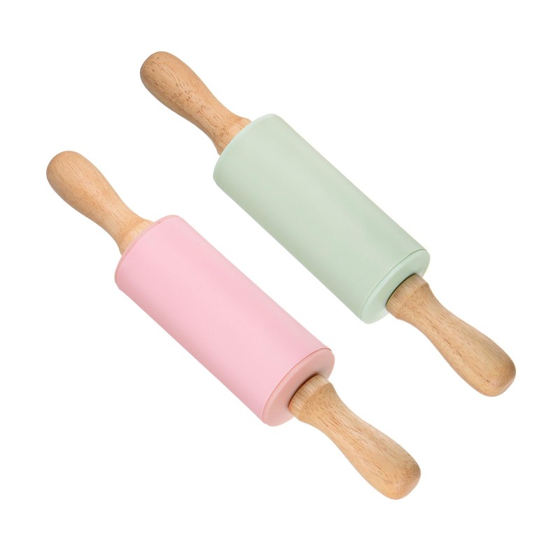 CoCud Silicone Rolling Pins, 9.25" Length, Silicone & Oak Non-Stick Ergonomic Wooden Handle Fondant Dough Roller Light Green & Pink - (Applications: for Baking DIY Projects)