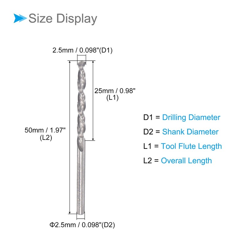 - ★ Carbide Drill Bit Size --- Drilling diameter: 2.5mm / 0.098"; tool flute length: 25mm / 0.98"; shank diameter: 2.5mm / 0.098"; overall length: 50mm / 1.97"; drilling direction: left hand; tool flute type: spiral; hardness: 91HRA