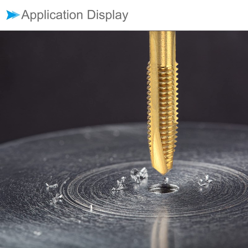 --- The high speed steel tool has high hardness, high strength, good toughness, and wear resistance, good for general purpose applications. Titanium (TiN) coating greatly improves hardness and wear resistance, reduces friction coefficient. The tapping depth should not be over 1.5 times the diameter of the tap (eg: diameter=6mm (M6), maximum tapping depth=9mm). Drill holes with a twist drill before tapping. The tapping angle should be 90 degrees vertical and stable.