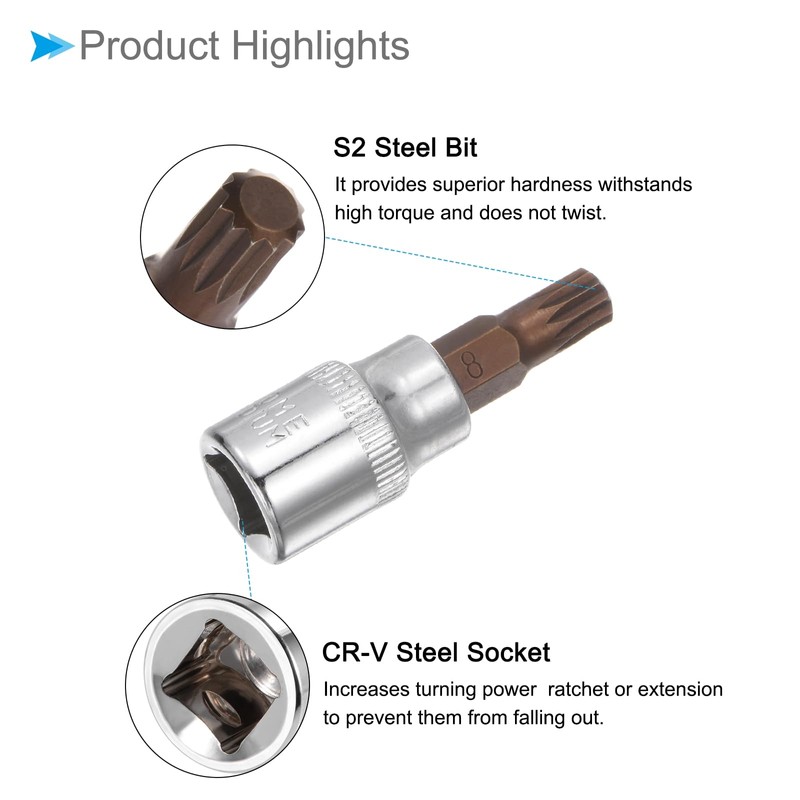 - ★ S2 Steel & CR-V --- The Spline Bit Socket is made of S2 alloy steel with high hardness and strong rust resistance. The chromium-vanadium steel sleeve increases the rotation power.