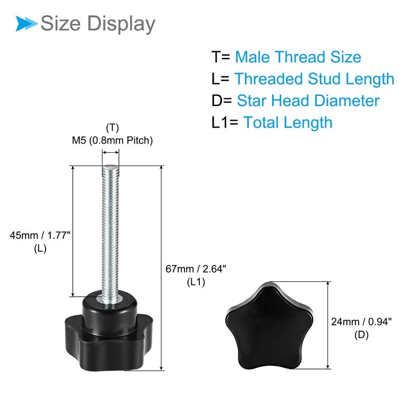 • ★Star Lamp Knob Size---Male Thread Size:M5(0.8 mm pitch); Threaded Stud Length:45 mm; Head Diameter:24 mm; Total Length:67 mm; Color: Black, Silver Tone