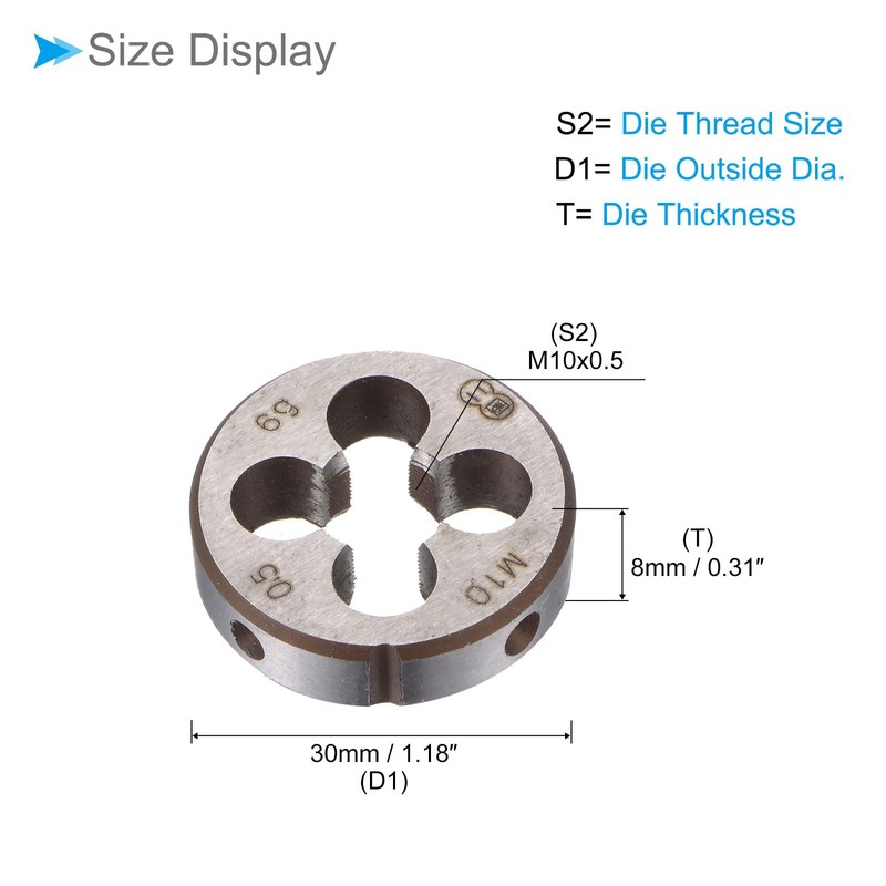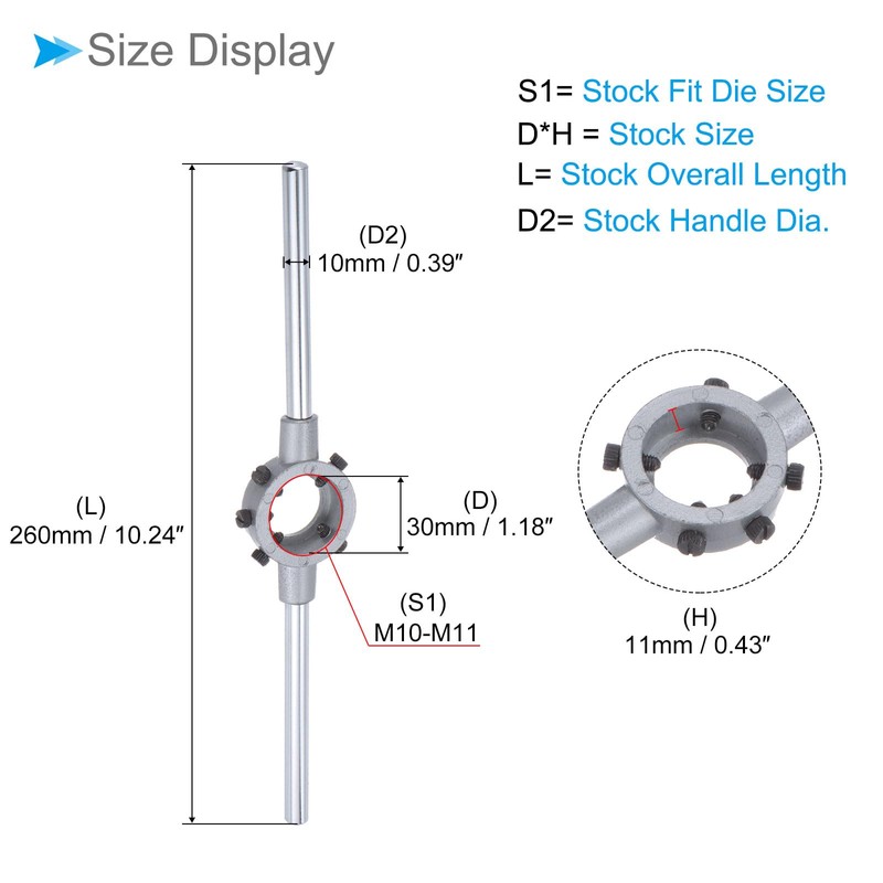 - ★ Thread Die & Stock Set Size --- Thread Die Size: M10x0.5; Outer Diameter: 30mm / 1.18"; Thickness: 8mm / 0.31". Stick: 30 mm x 11 mm / 1.18 inches x 0.43 inches (D x H); matching thread die size: M3.5-M6; total length: 260 mm/10.24 inches; handle diameter: 10 mm/0.39 inches