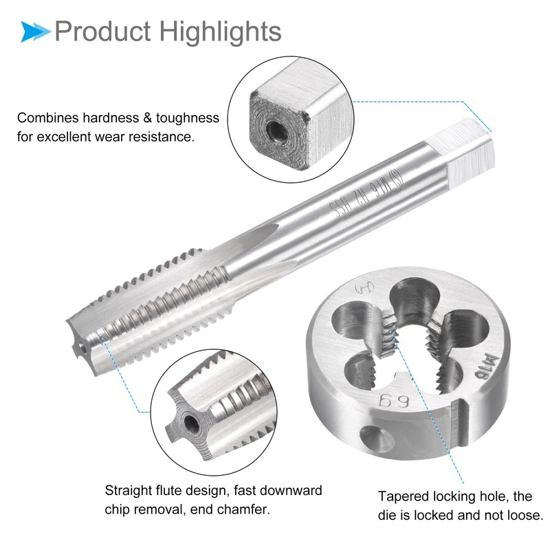 • ★ Ease of Use --- The machine tap is designed with straight flutes and fast downward chip removal, suitable for tapping machines, drilling machines, CNC and milling machines. The die locks firmly and will not loosen, use with the die handle or adjustable wrench to apply pressure and rotate the die around the component to produce the desired threads.
