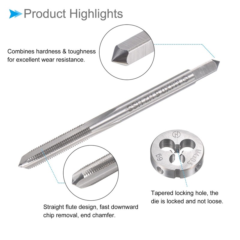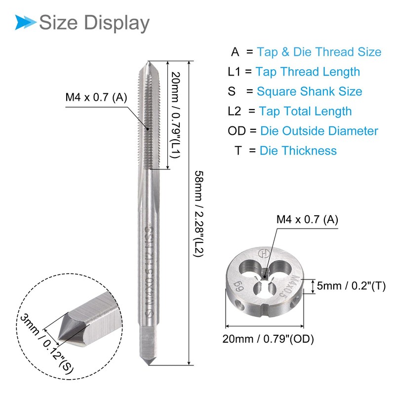 • ★ Tap and Die Set Size --- Tap & die thread size: M4 x 0.5; tapping direction: right hand; tap accuracy: H2; square shank size: 3mm / 0.12"; tap thread length: 20mm / 0.79"; tap total length: 58mm / 2.28"; die outside diameter: 20mm / 0.79"; die thickness: 5mm / 0.2"