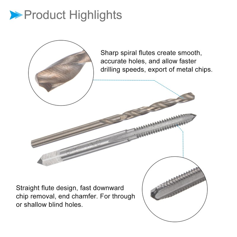 - ★ Easy to use --- The tap with straight flutes and fast chip removal downwards is designed for tapping machines, drills, CNC and milling machines. The twist drill with its sharp spiral grooves can make even and accurate holes and allows higher drilling speeds, chip removal and improved coolant flow.