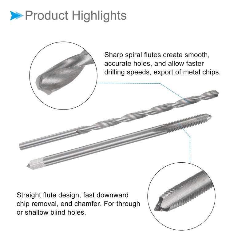 - ★ Easy to use --- The tap with straight flutes and fast chip removal downwards is designed for tapping machines, drills, CNC and milling machines. The twist drill with its sharp spiral grooves can make even and accurate holes and allows higher drilling speeds, chip removal and improved coolant flow.