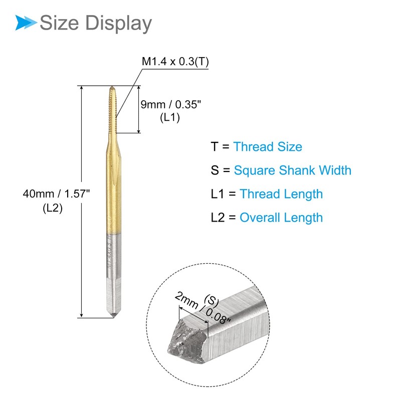 - ★ Screw Tap Size --- Screw Size: M1.4 x 0.3 (right hand); Corner Shank Width: 2 mm; Thread Length: 9 mm; Overall Length: 40 mm; Accuracy: H2; Flute Quantity: 3 flutes