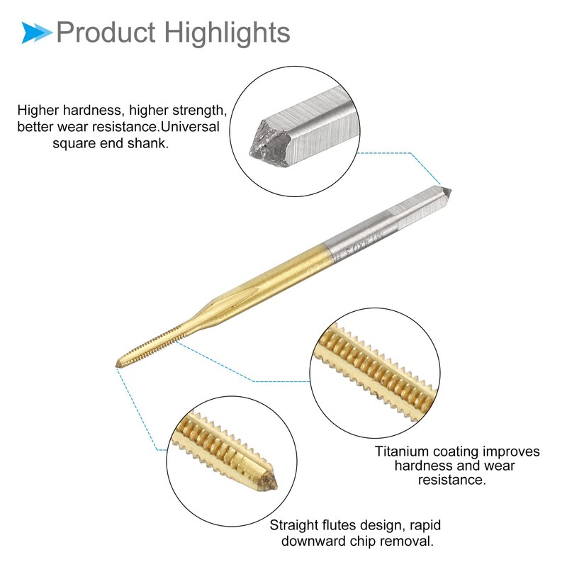 --- Suitable for threading through and shallow holes. 3 straight groove design, rapid downward shavings disbursement Create new female threads in stainless steel, ordinary steel, copper, aluminum, iron, alloy steel and hard plastic or re-screw damaged female threads. Machine taps are used in tapping machines, vertical drilling machines, and milling machines. The M1-M3.5 micro taps have a low hardness of wood and soft metals and are primarily used for watches.