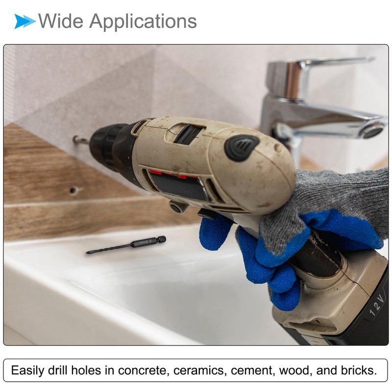 --- A 1/4-inch hexagonal shank masonry drill bit suits common electric, hand, and bench drills. It is easy to install and remove, and can easily drill holes in various materials such as concrete, glass, ceramics, cement, wood, bricks, hard plastics, etc.