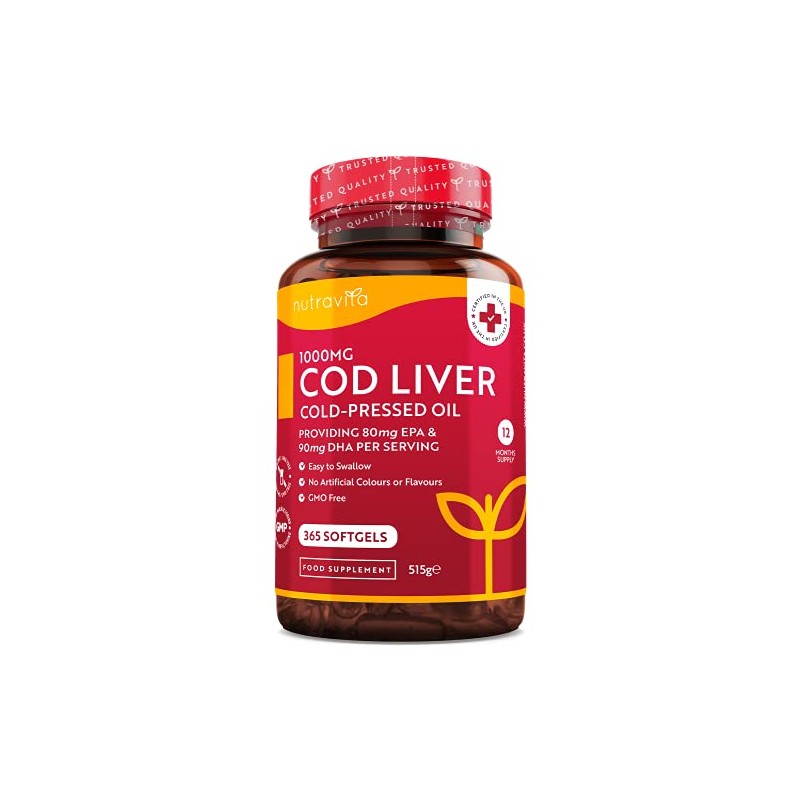 Cod Liver Oil 1000mg - 365 Softgels of Premium Cold Pressed Fish Oil - Rich in High Strength Omega 3, Vitamins A, D, E & Garlic Oil - Supports Heart & Brain Health - Made in The UK by Nutravita