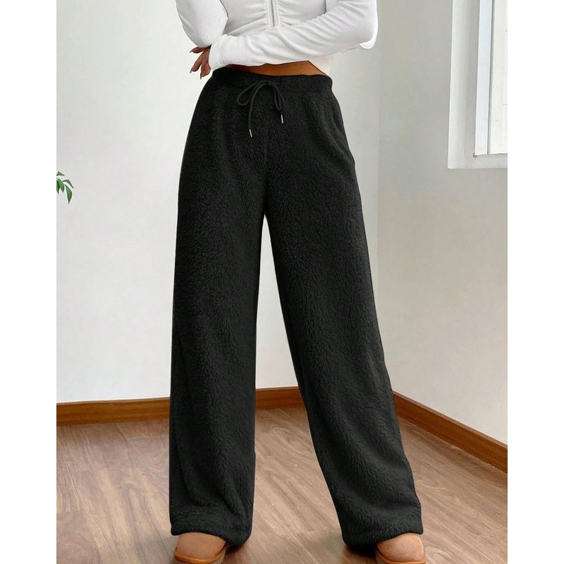 codcm Women's Fuzzy Lounge Pants Comfy Warm Fleece Pajama Long Pants Drawstring Elastic Waist Wide Leg Bottoms(Black,Small)