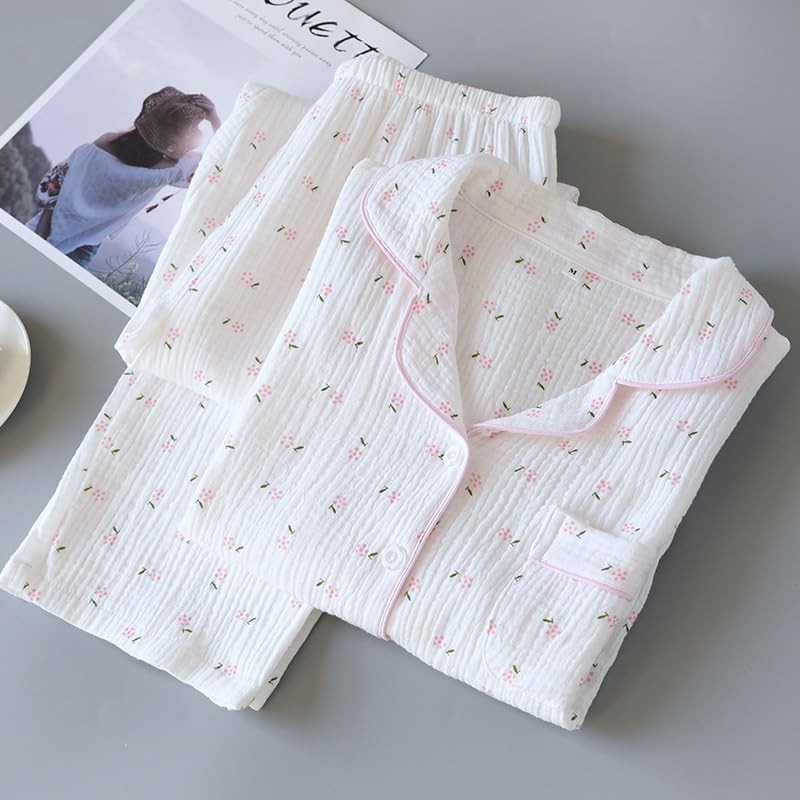 - Material:This cute 2 piece pajama sets for women is made of 100% cotton double gauze.Lightweight,comfy,breathable,and skin-friendly,soft cotton help you have a sound sleep.