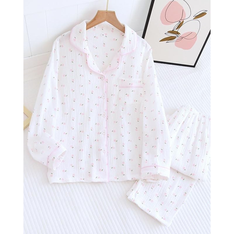 codcm Womens Cotton Gauze Pajama Set Floral Print 2 Piece Pjs Long Sleeve Button Down Sleepwear Cute Pj Sets(White Flower,X-Small)