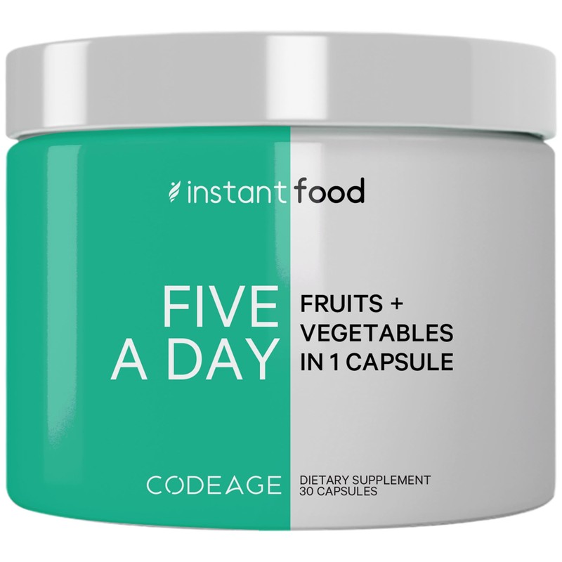 - 7 Non-GMO Veggies Supplement: Codeage Instantfood Five a Day is a vegan whole food blend enriched with 7 green foods and extracts, including broccoli, onion, tomato, carrot, spinach, kale, and brussels sprout in a capsule form. One daily serving of this healthy greens fruits and vegetable vitamins formula offers the equivalent of 3 servings of vegetables phytonutrients.