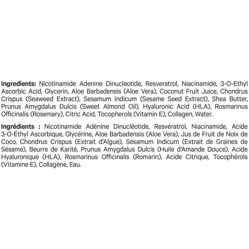 - Active Ingredients: Nicotinamide Adenine Dinucleotide, Resveratrol, Niacinamide, 3-o-Ethyl Ascorbic Acid, Glycerin, Aloe Barbadensis, Coconut Fruit Juice, Chondrus Crispus, Sesamum Indicum, Shea Butter, Prunus Amygdalus Dulcis, Hyaluronic Acid, Rosmarinus Officinalis, Citric Acid, Tocopherols, Collagen, Water