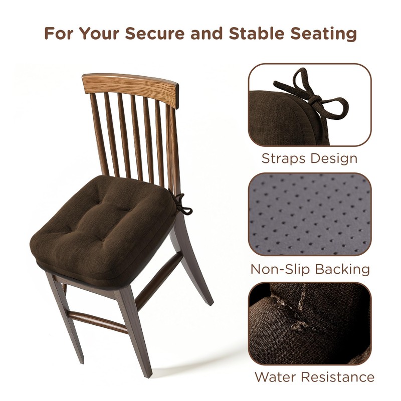 Codi Codi 6 Pack Dining Chair Cushions, Thick Chairs Pads for Indoor Kitchen Room - Washable, Non-Slip Memory Foam Seat Cushion with Ties, 16.5"x16.5"x 3.5", Set of 6, Brown
