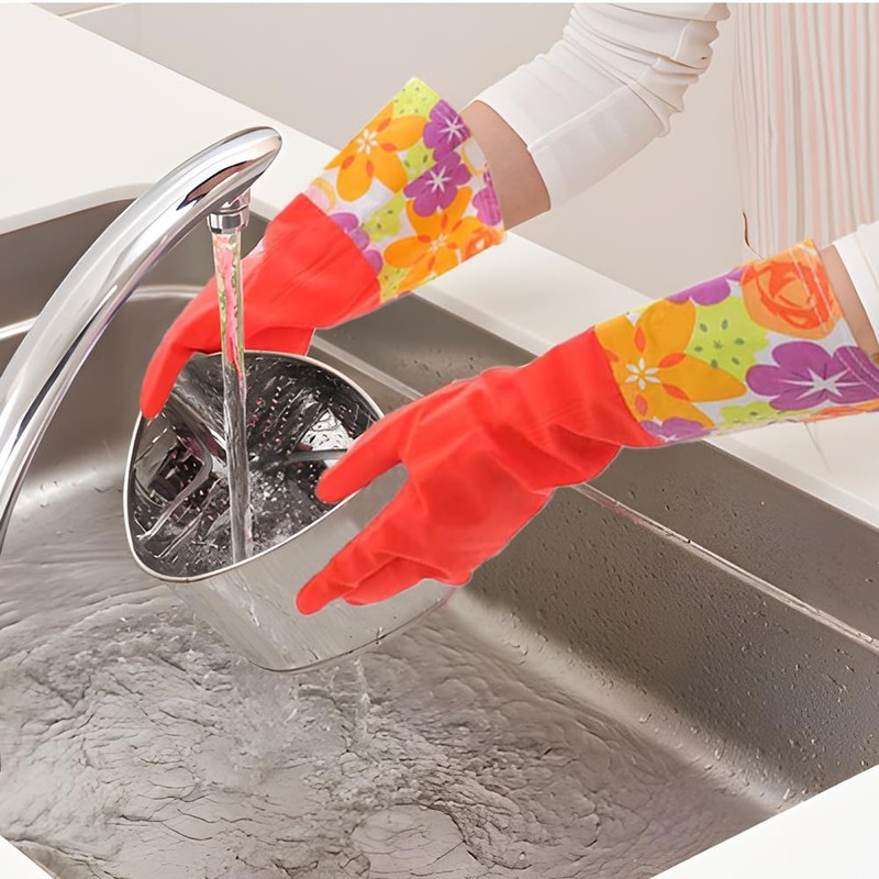 Codian Reusable Long cuff Rubber Kitchen Cleaning Gloves with Non-Slip Texture and Thick Fleece-Lined for Washing Dishes, Cleaning(1Pairs)