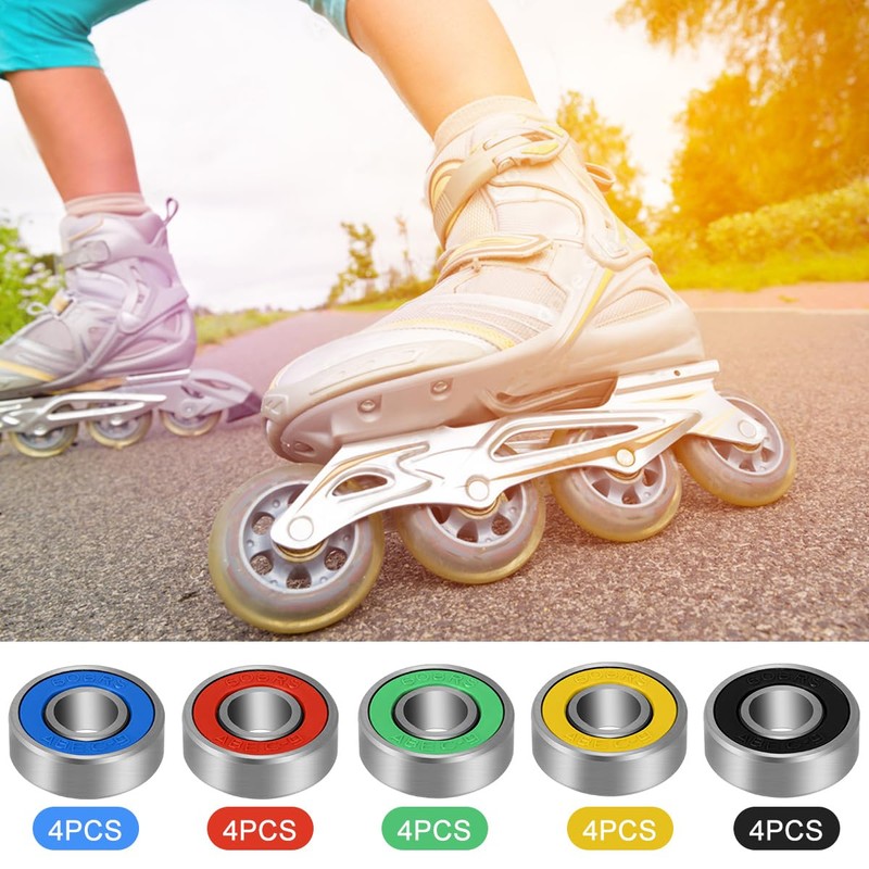 - [5 different colours] - The set contains 20 pieces of grooved skateboard ball bearings, which is enough to meet the different replacement and spare parts needs of the user. With the five different colours red, yellow, black, blue and green, it is not only cool and fashionable, but also highlights the overall beauty of the device. 608RS deep groove ball bearings with both appearance and performance have excellent performance and offer you a new experience!