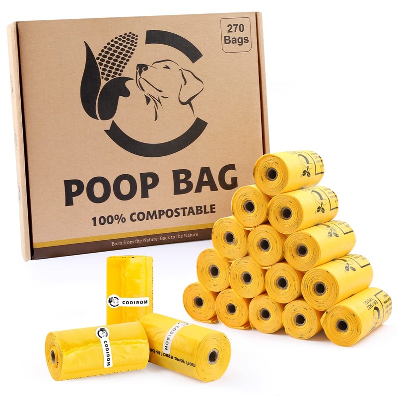 - 🌱 Codirom Dog Poop Bags are made from eco-friendly materials such as corn, vegetable oil, and PBAT (fully compostable polymers). Keep bags away from heat and store them in a cool, dry place. Compost bags have a shelf life of approximately 12 months, so please purchase only what you can use within 10 months.