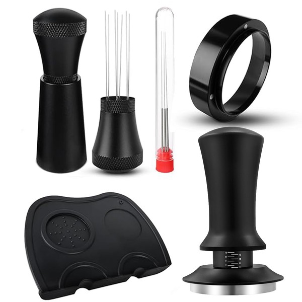 Coffee Accessories Set, with Coffee Tamper 58mm, WDT Tool Espresso, 58mm Dosing Funnel, Tamper Mat, 100% Flat Stainless Steel Base Spring-Loaded Tamper for Espresso Coffee Machine, Black Wide Application:Cafe. Office. Home. Milk-Tea 58mm Tamper Dosierring 58mm Tamper Mat 1. Add coffee powder 2. Stir well 3. To flatten 4.Smooth coffee Dosing Funnel & Tamper Mat: The 58mm dosing ring and coffee tamper mat is ideal for use with coffee distribution tool set. High-quality: Coffee tamper is made of a 304 stainless steel base with an Aluminum alloy handle. Vertical Tamp & Adjustable Depth: Espresso tamper with scale markings better than traditional coffee tampers, the improved design adds springs inside for easier tamping and automatic rebound Coffee Tamper 58mm Set:A professional espresso tools barista set includes a 58mm coffee tamper, espresso wdt tool, 58mm dosing funnel and coffee tamper mat. With one set, you can start enjoying the pleasure of making your own rich and aromatic espresso right away