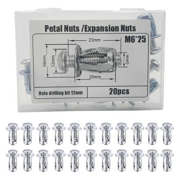 Coffee Life Plus® Pack of 20 Expansion Screw Petal Nuts, Jack Nuts, M4, M5, M6, M8 Thin Fixings Dowels, Hollow Mounting Material Screws Assembly (M6 x 25 mm (20 Pieces))