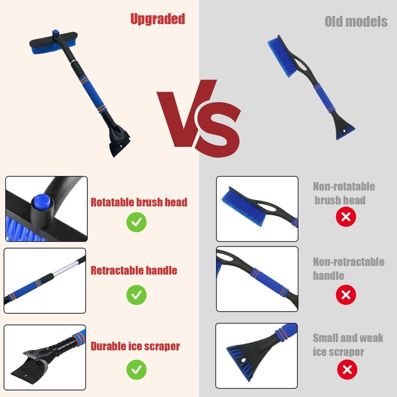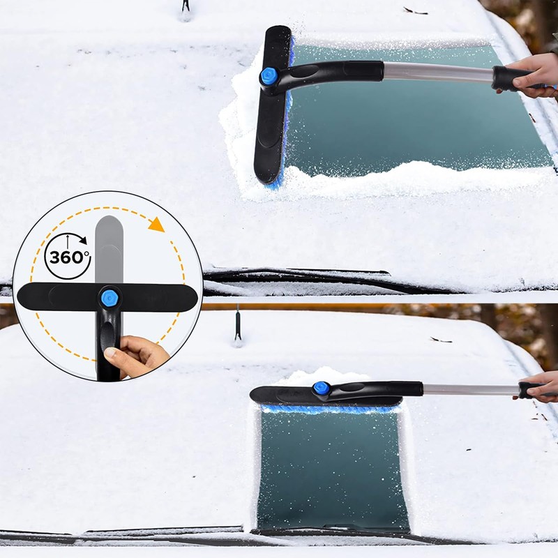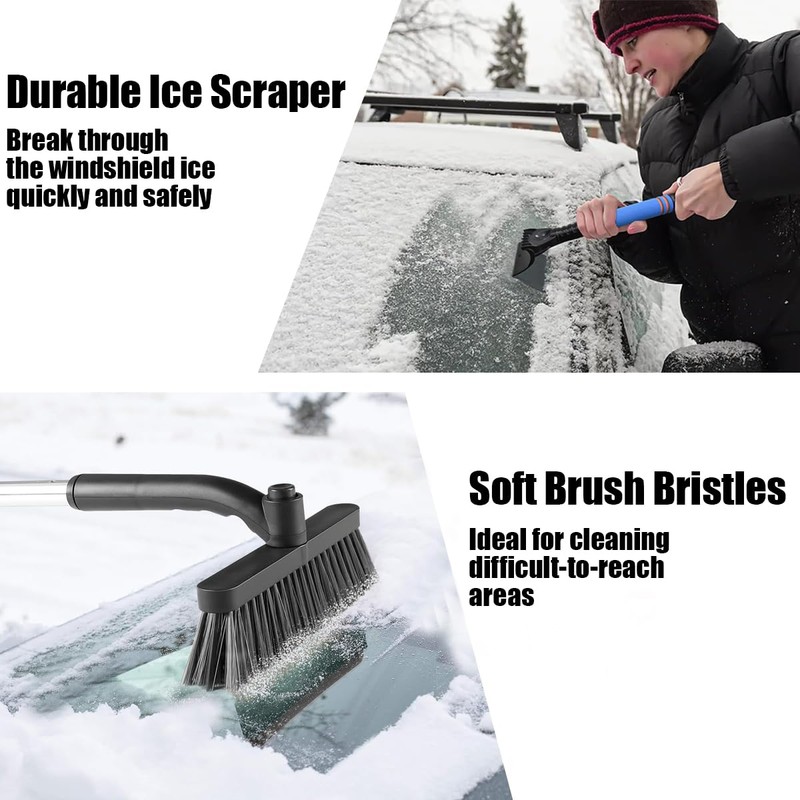 • 2-in-1 car snow brush: Our car snow clearing brush has an ice scraper and a rotating snow clearing brush head. The ice scraper can easily break up thick ice and the brush head sweeps the snow away.