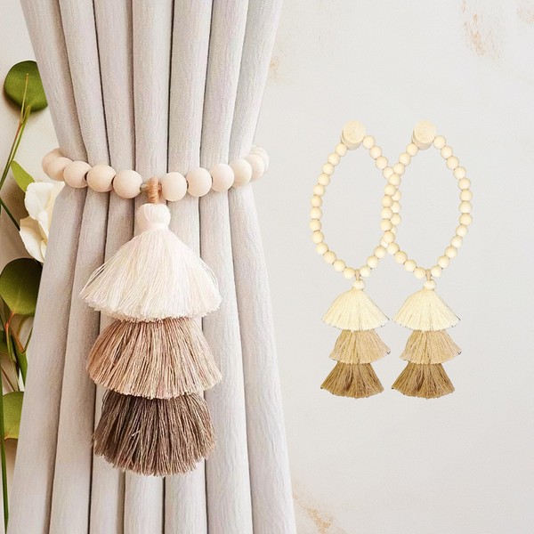 Coffee Magnetic Wooden Bead Curtain Tiebacks No Drilling,Boho Curtain Tassel Tiebacks for Curtains 2 Pack,Boho Western Decor