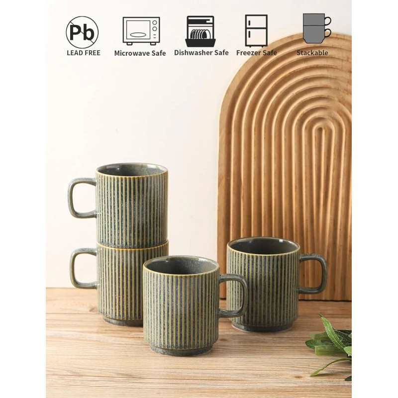 Coffee Mugs Set of 4, Ceramic Ribbed Tea Coffee Cups with Handle, Large Porcelain Mug for Americano, Latte, Cappuccino, Hot Chocolate, Green