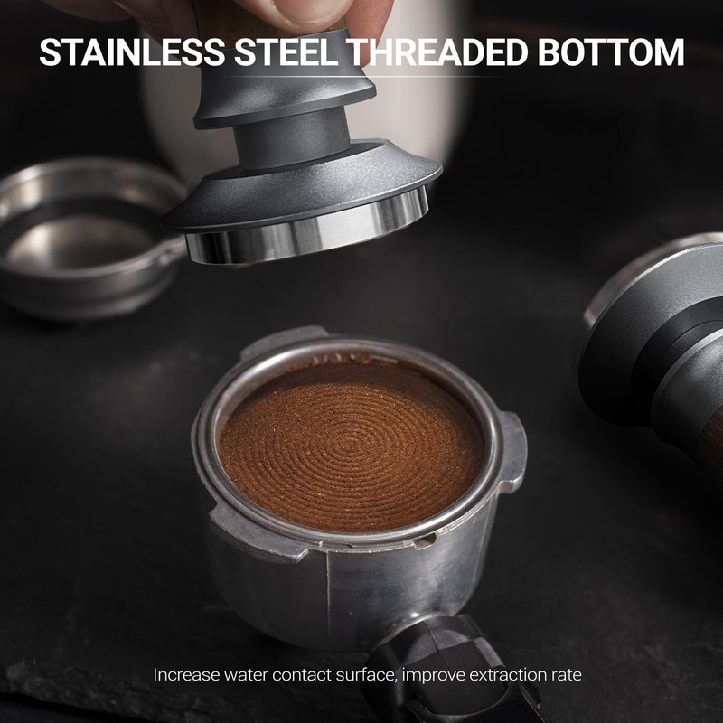 - 【Stainless Steel Threaded Base】The tamp base goes right to the edge of the basket walls without gap. The tamp base is ridged so you can see the stamped pattern after tamping, which aides in visualizing the evenness of your tamp.
