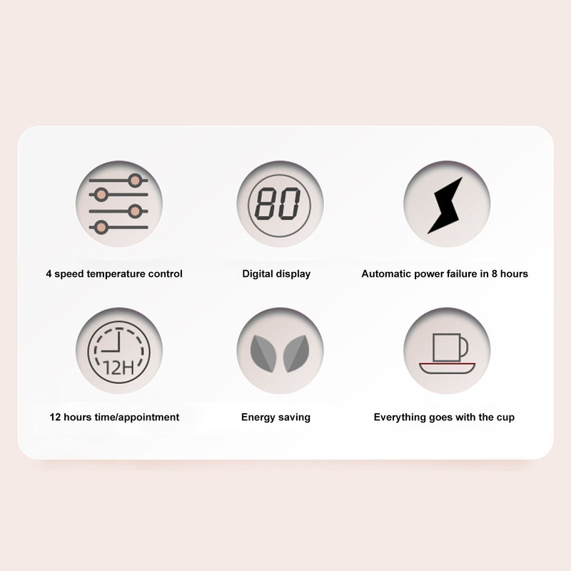 1、Slows Down Cooling: The electric cup warmer effectively slows down the cooling speed of your hot coffee, keeping it at the perfect drinking temperature for an extended period. 2、Temperature Control: Easily adjust and maintain your desired temperature for coffee or tea at 130℉, 140℉, 150℉, 160℉, 170℉, or 180℉ by simply touching the screen (not for boiling). 3、Multi Functionality: The electric cup warmer is versatile and can be used to heat cups for coffee, tea, milk, hot chocolate, and other beverages, catering to various drink preferences. 4、Portable Convenience: With its compact and lightweight design, the electric cup warmer takes up minimal space and is highly portable, allowing you to enjoy warm beverages wherever you go. 5、Perfect Gift Idea: Whether it's for Christmas, Thanksgiving, Valentine's Day, birthdays, or anniversaries, the electric cup warmer makes a perfect gift for your mother, father, loved ones, friends, and family, adding a touch of warmth and convenience to their everyday lives.