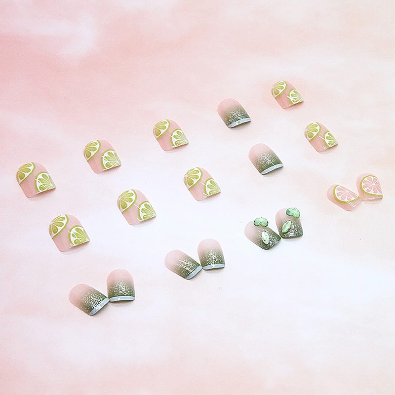 Coffin Full Cover Reusable False Nails with Lemon Green Rhinestone Designs, Press on Nails Short Square Shape with Sticky Tabs, Glue on Nails with Charm, Artificial Finger Acrylic Fake Nails for Women