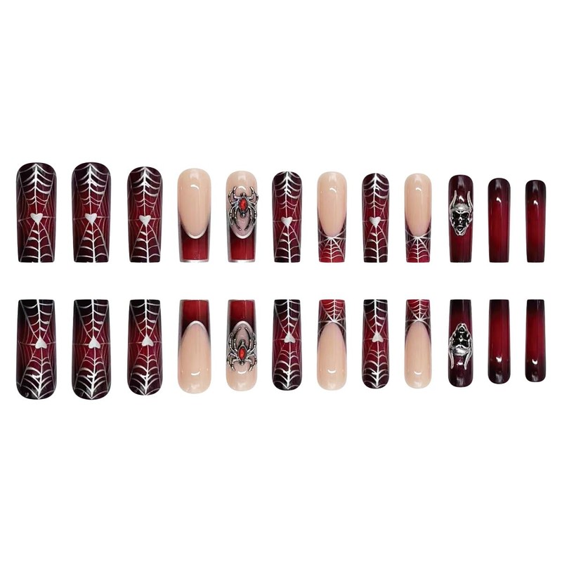 Coffin Press on Nails Long Square Fake Nails Black Wine Red Gradient Glue ons Nails Metallic Spider Skull Charms Spider Web Design Halloween Acrylic Luxury Goth Squoval False Nails for Women 24Pcs