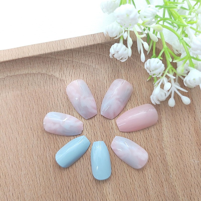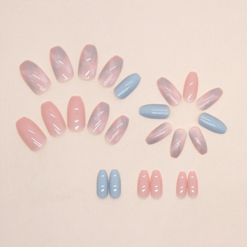 Coffin Press on Nails Short Fake Nails with Marble Designs Pink Blue Acrylic Nails Press ons Glossy Glue on Nails Artificial False Nails Reusable Stick on Nails for Women 24 Pcs