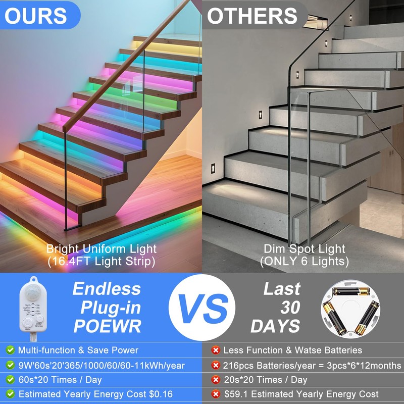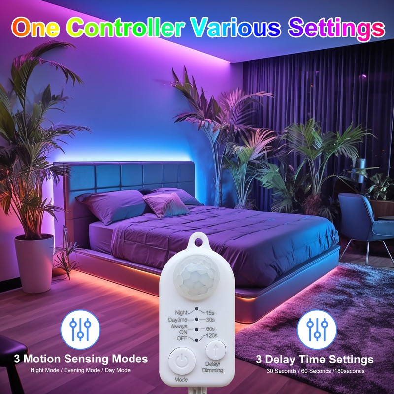 - ★ Unidirectional sensor: Equipped with a sensor on one side of the light strip, it is very suitable for stairs, double beds, corridors, living rooms, or garages.
