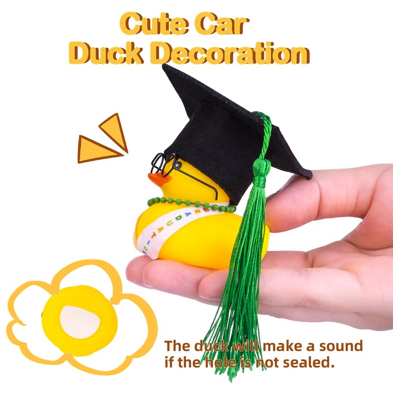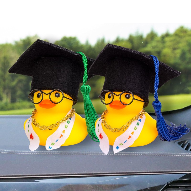 - Gorro de graduación: patos de goma para salpicadero de coche con un mini sombrero de graduación, anteojos de sol, collar y faja. El pato de goma para salpicadero de coche puede decorar tu coche muy bien, añadir algo de diversión y aliviar la fatiga durante el viaje de conducir un coche.