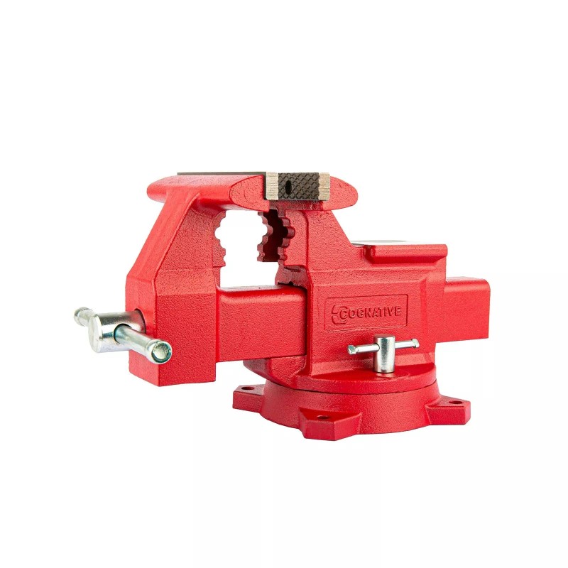 The COGNATIVE 6.5-Inch Precision Swivel Bench Vise has a 360-degree swivelbase and mounts to a workbench to provide clamping action. The 360-degreeswivel base adjusts the direction of the jaws for proper placement. Hand-tightening the two lock knobs on the base secures its position. The body ismade of cast steel and has a black painted finish for mild corrosionprotection. A flat portion on the body acts as a reinforced anvil and anadditional work surface. The top jaws are made of hardened steel and can bereplaced when worn, and the built-in pipe jaws are cast steel. Body Material:PSI 60,000 ductile iron Jaw width: 6.5 inch/165mm Opening: 6 inch/150mm ThroatDepth:3.74 inch/95mm Item Weight: 26.4 lbs Size: 14.4 x 6.46 x 8.07 InchColor: Red