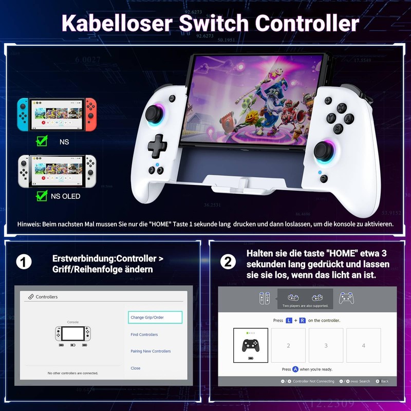 - ERGONOMICALLY DESIGNED WIRELESS SWITCH CONTROLLER The all-in-one gamepad controller is compatible with Switch/Oled, the controller handle provides ultimate comfort and control, perfect for handheld mode. The switch controller features Bluetooth connectivity for an instant connection and a lag-free gaming experience. After the first successful connection, you can use the "Home" button to automatically wake up and restore the connection.