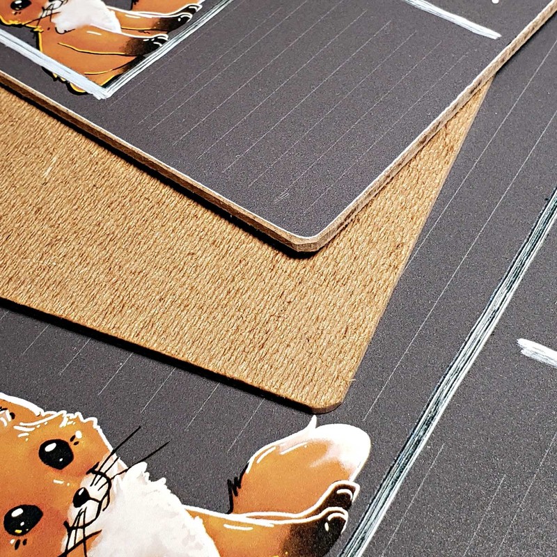 The board features real chalk art and a chalkboard surface embedded onto a hardboard material cut to size. Round corners are stamped to avoid sharp edges. Finished board measures 12 by 16 inches, by 0.13 inches thick.