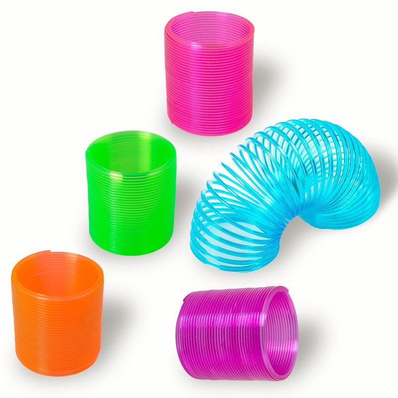 - These small party favors are bright coil springs for kids. Plastic mini toys have 5 colors - pink, purple, blue, orange and green. Small coils are 30 mm / 1.2 inches in diameter