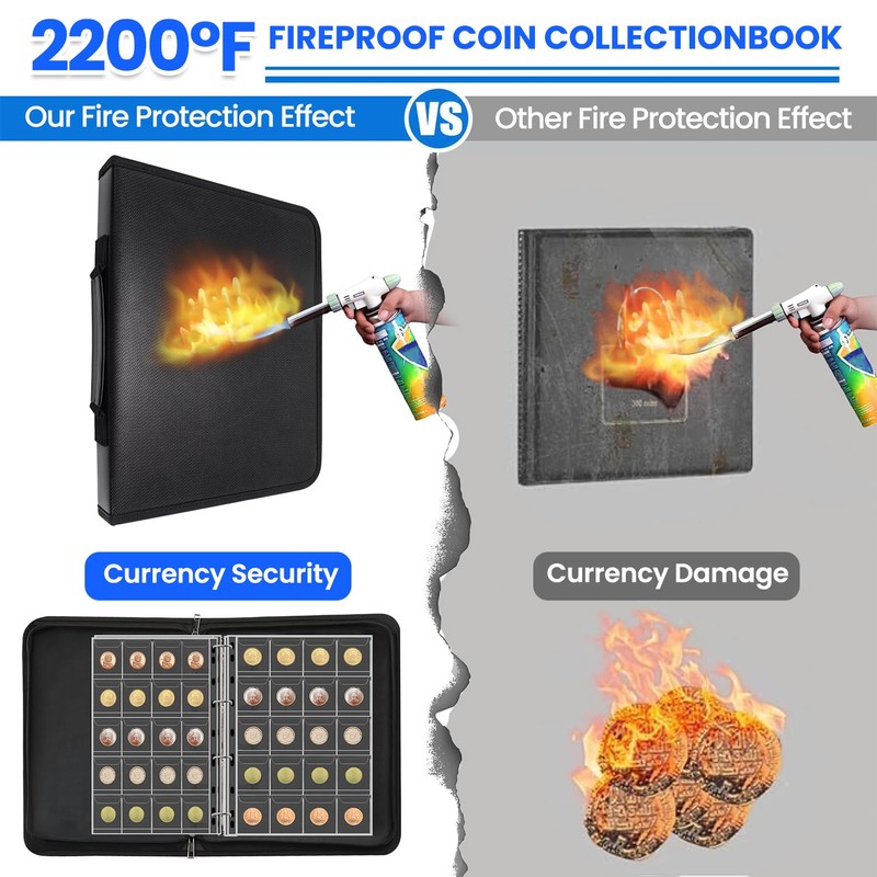 - Fire-Retardant Safe Protection with a Handy Feature: Our coin collection book, crafted from silicone-coated fiberglass, offers robust defense against fires with a capacity to withstand temperatures up to 2200°F. Pair it with a fireproof safe for double the protection. This coin collection book, a vital part of your coin collection supplies, now comes with an added convenience – a sturdy handle for easy transport.