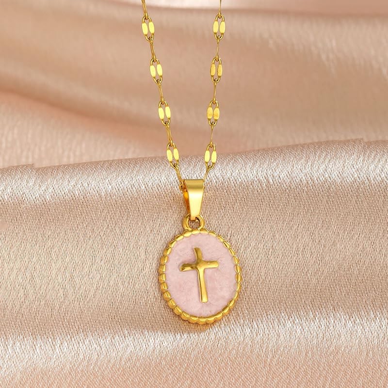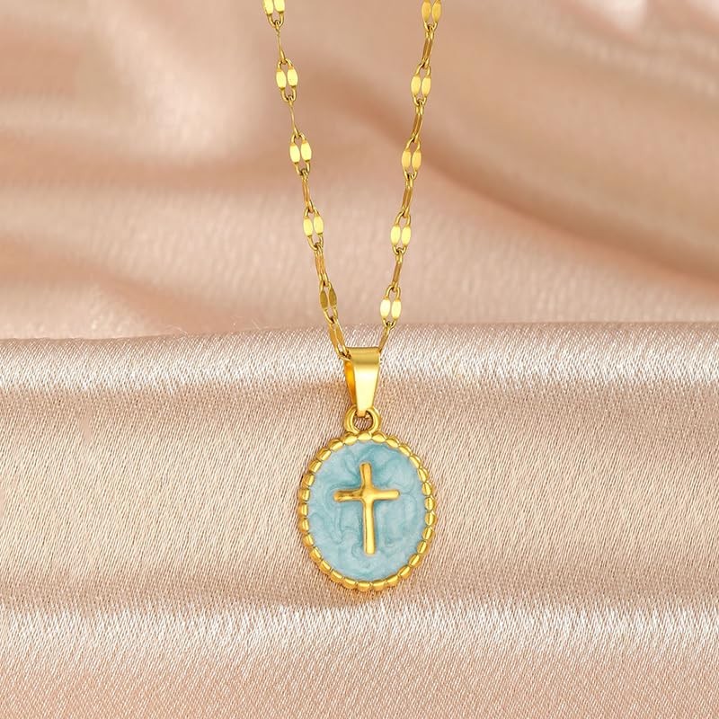 - Luxury Chain: This Necklace Available In Three Soft Hues: Sky - Blue, Cream - White, And Blush - Pink. Each Color Filled Pendant Is Framed In Gleaming Gold. Our Gold Cross Pendant Necklaces Meaningful Pieces Blend Spiritual Symbolism With Modern Style, Add A Touch Of Divine Charm To Your Jewelry Collection