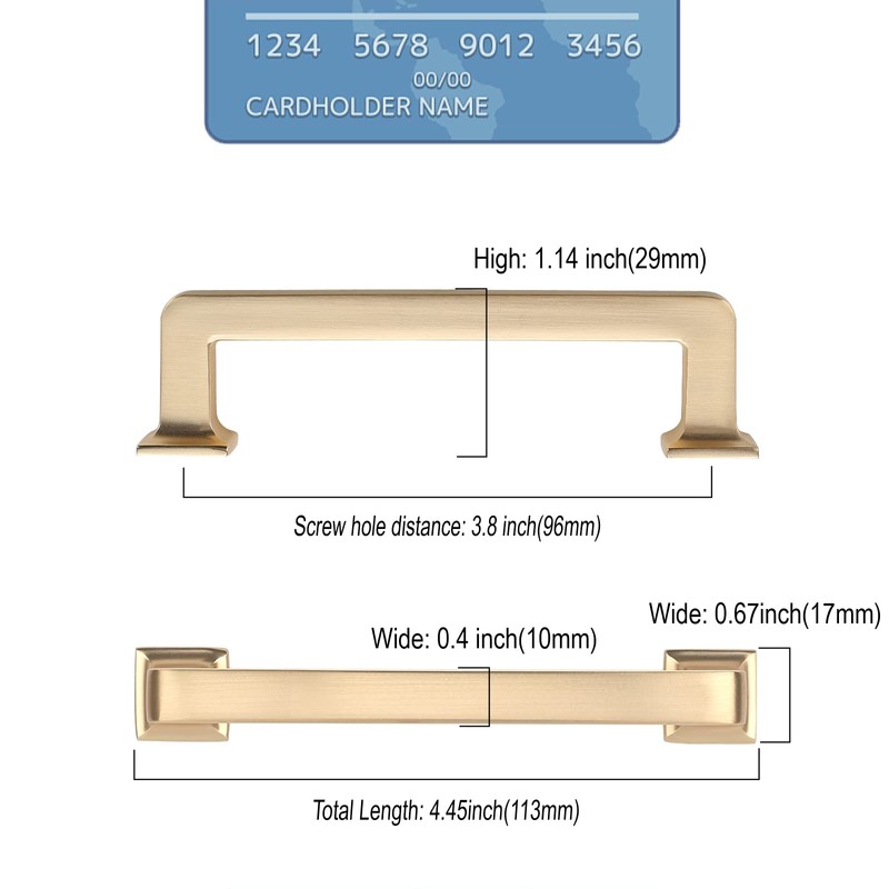 - 【Size of Cabinet handles】 Hole Centers(CC): 3.8"(96MM); Overall Length: 4.45"(113MM); Projection: 1.14"(29MM) from the surface to the bar; Width: 0.4"(10MM);