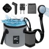 【Upgrade Shower Pump】 This portable camping shower is made of a reliable, durable and quiet motor, giving you a peaceful outdoor camping shower environment. The shower's bottom suction design with four suction feet on the bottom, which can be sunk under the water and hold the bucket firmly. Equipped with a PP element, it can filter out mud, dust, etc. from the water, addressing skin issues post-shower and easy to clean.