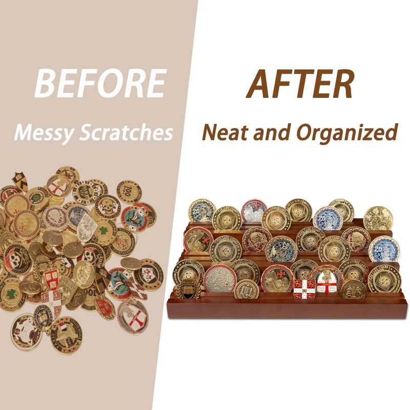 - Exquisite Craftsmanship, Solid Wood Construction: Our Cokritsm Challenge Coin Display Stand is meticulously handcrafted from high-quality natural wood, featuring a unique 3-tier design. This display stand is not only sturdy and durable but also elegantly designed, providing the perfect platform to showcase your challenge coin collection