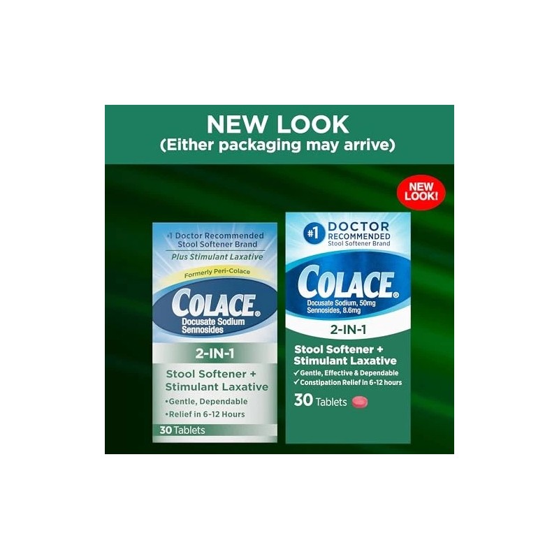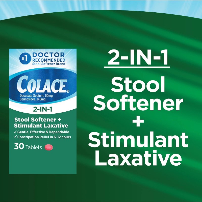 Relieve occasional constipation with Colace; 2-IN-1 Tablets Docusate sodium, a stool softener, allows water and fats to get into the stool Standardized senna concentrate is a laxative that helps to gently stimulate motility of the intestines Gentle, dependable relief in 6-12 hours Safe, gentle, and effective