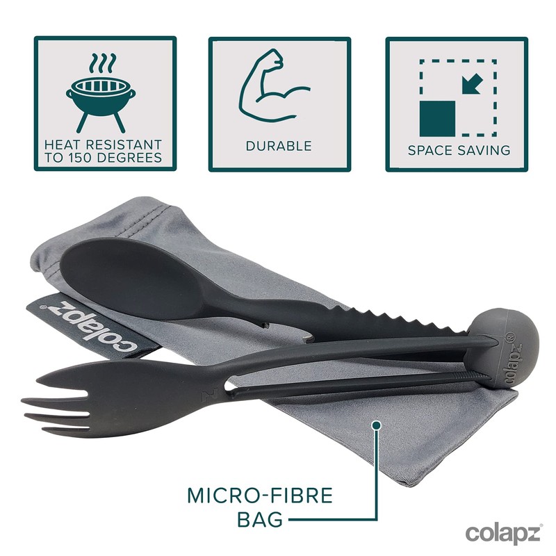 - STORAGE POUCH INCLUDED - The included pouch not only stores your 7 in 1 cutlery set but also doubles up a handy cleaning cloth! Meaning all utensils can be easily cleaned and stored after use. The Colapz 7-in-1 is available in the 4 distinctive Colapz colours. Cool Grey, Green, Blue and Red.
