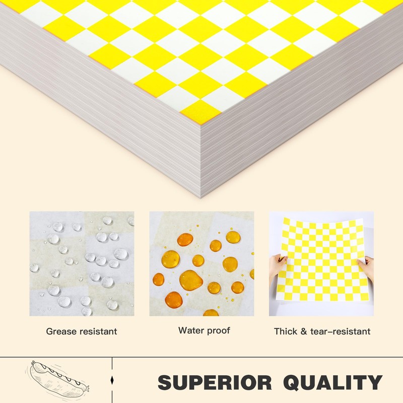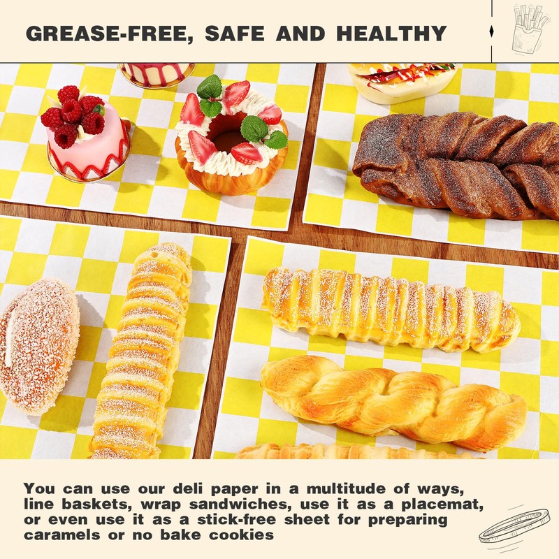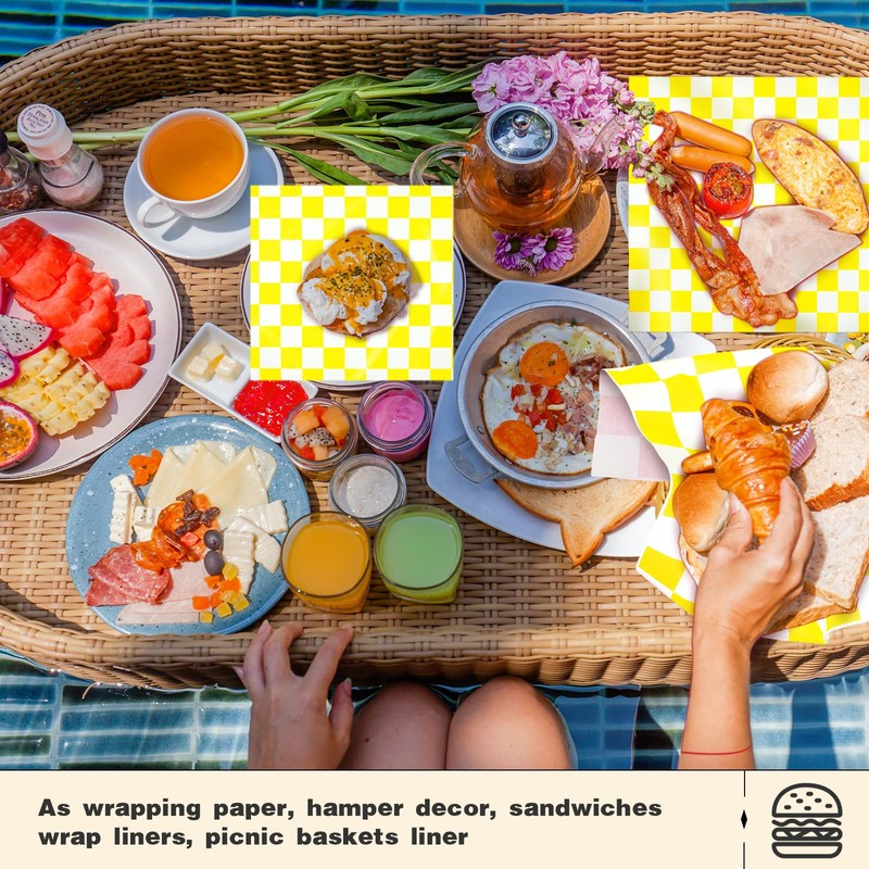 - Yellow Checkered: the deli wrap can be applied not only for wrapping food to ensure food is fresh and absorb grease but also for plates or basket lining decorating or pair them with small wooden serving trays, which can spice up your food with a yellow checkered design