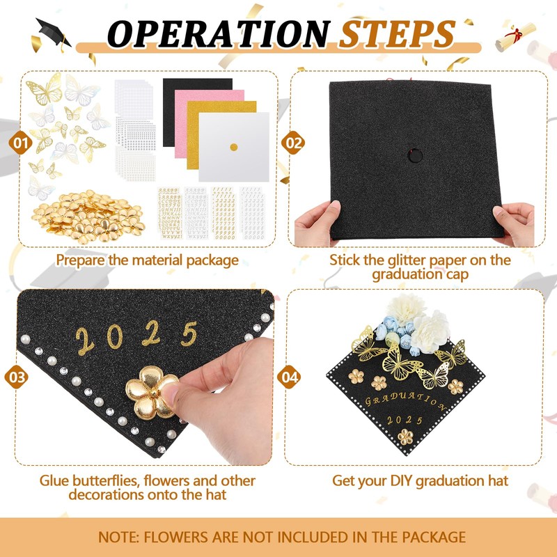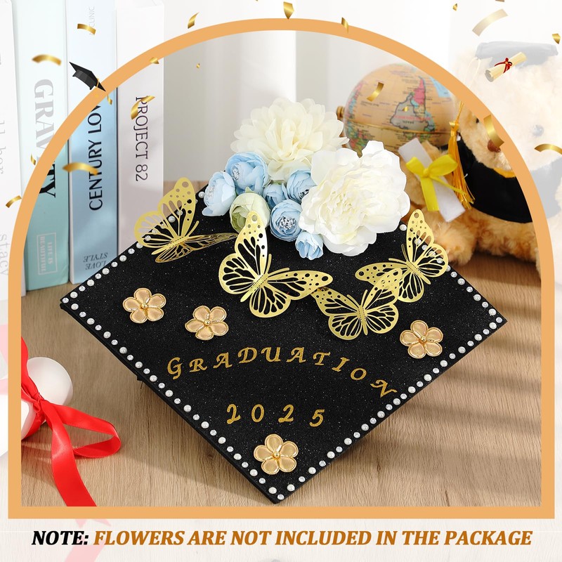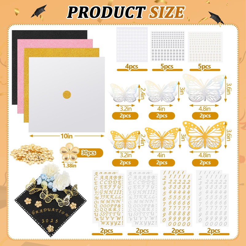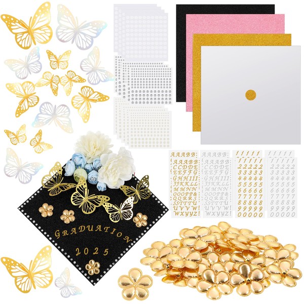 - Comprehensive Kit for Endless Creativity: unleash your artistic potential with our extensive DIY craft decoration kit; Packed with 4 glitter cardstock, 12 3D butterfly stickers, 4 letter stickers, 4 number stickers, 5 pearl stickers, 5 diamond stickers, 30 gold flowers, this kit has everything you need to craft striking and personalized designs that make any graduation cap pop and reflect your unique style