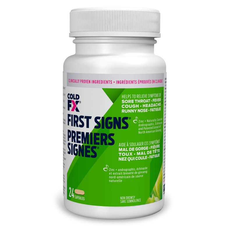 - MULTI-SYMPTOM RELIEF: COLD-FX FIRST SIGNS is a Natural Health Product that helps shorten the duration of upper respiratory tract infections; This non-drowsy formula helps relieve symptoms of sore throat, fever, cough, headache and runny nose